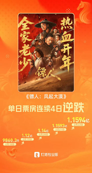 在2026年春节档的激烈角逐中,电影《镖人:风起大漠》以排片垫底的劣势开局,却凭借硬核武侠质感与观众口碑的裂变式传播,上演了一场罕见的票房逆跌奇迹——连续8天单日票房不降反升,最终以超12亿的票房登顶中国影史武侠片冠军,实现口碑与市场的双赢。