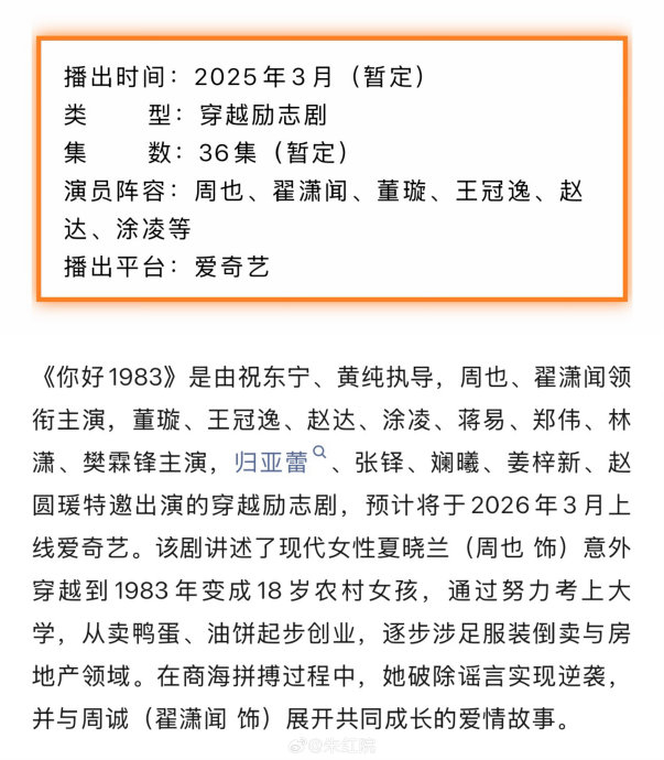 电视剧《你好1983》将于2026年3月17日在爱奇艺独家播出,该剧由周也、翟潇闻领衔主演,改编自热门小说《重生八零:媳妇有点辣》,讲述现代女性穿越回1983年逆袭创业的故事。