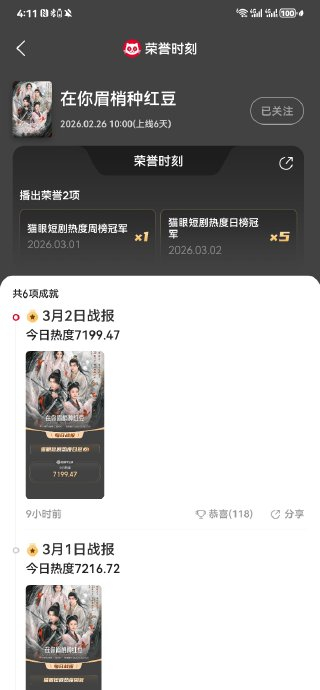 猫眼短剧热度周榜、日榜累计夺冠14次,单日热度峰值达7199。