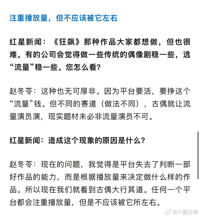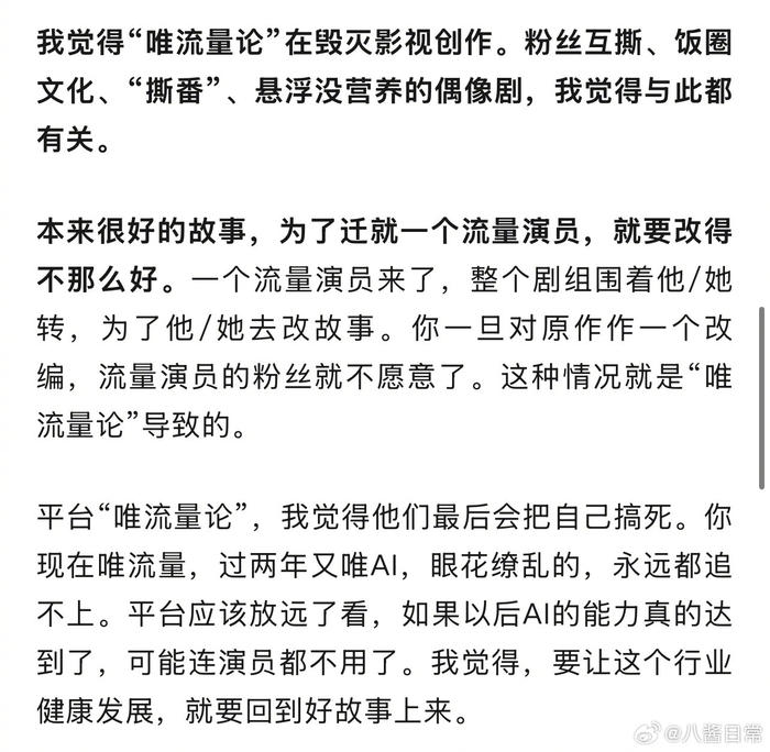编剧赵冬苓表示唯流量论正在毁掉影视创作:本来很好的故事,为了迁就一个流量演员,就要改得不那么好。一个流量演员来了,整个剧组围着他/她转,为了他/她去改故事。你一旦对原作作一个改编,流量演员的粉丝就不愿意了。这种情况就是唯流量论导致的