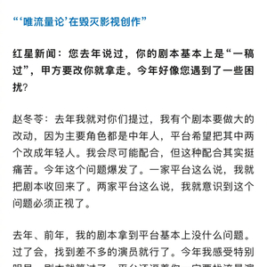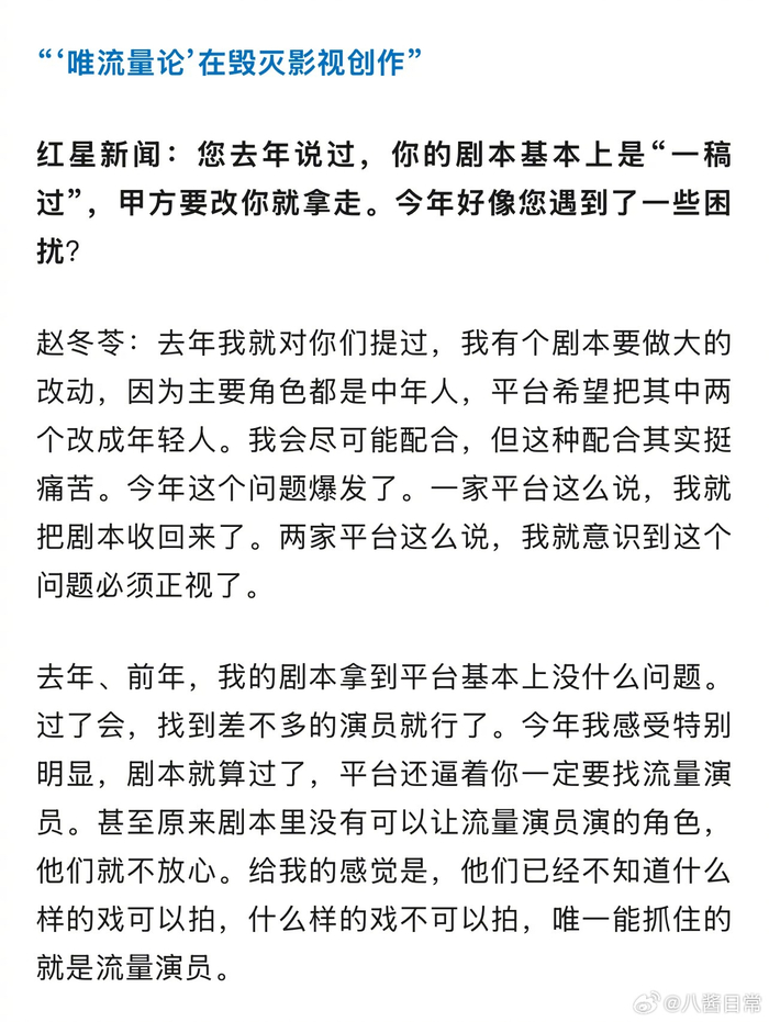 编剧赵冬苓批唯流量论致影视创作畸形,剧组为迁就流量演员改剧本