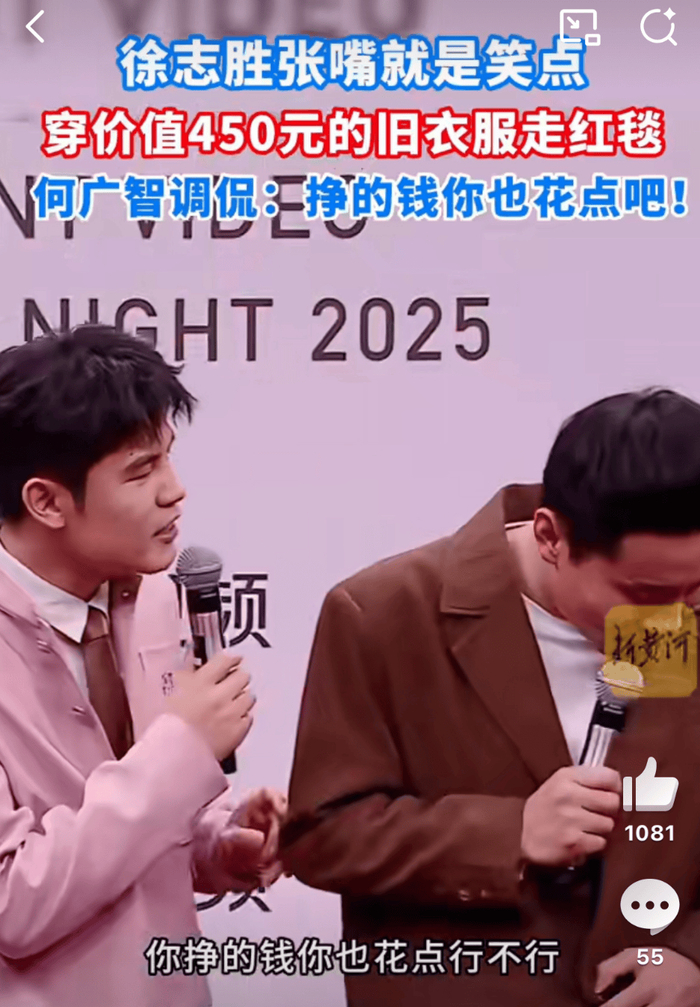 12 月 22 日,脱口秀顶流徐志胜和何广智的一段视频引发关注。原来是徐志胜走红毯时,自曝了礼服的真实价格。旁边的何广智听后忍不住调侃:“挣的钱你也花点吧,行不行!”