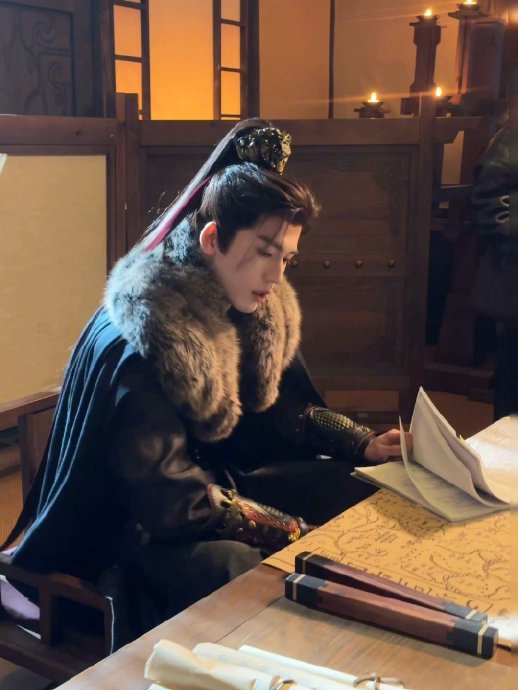 雉翎冠的美学溯源:与导演共创标志性雉翎头冠造型,参考游戏美学与传统戏曲元素,赋予角色视觉冲击力。他主动查阅史料考据雉翎象征意义,使其成为谢征戎马精神的图腾。