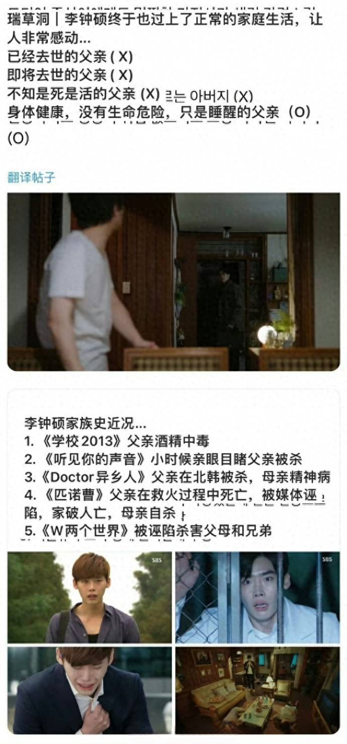 提到李钟硕的演艺生涯,悲惨家庭几乎成了他的代名词。从《听见你的声音》中目睹父亲被杀的少年张彗星,到《W-两个世界》里全家被灭门的漫画角色姜哲,再到《黑话律师》中妻子患癌的落魄律师朴昌浩……网友们调侃他是“韩剧里最惨的男主”,甚至称其为“克父专业户”。