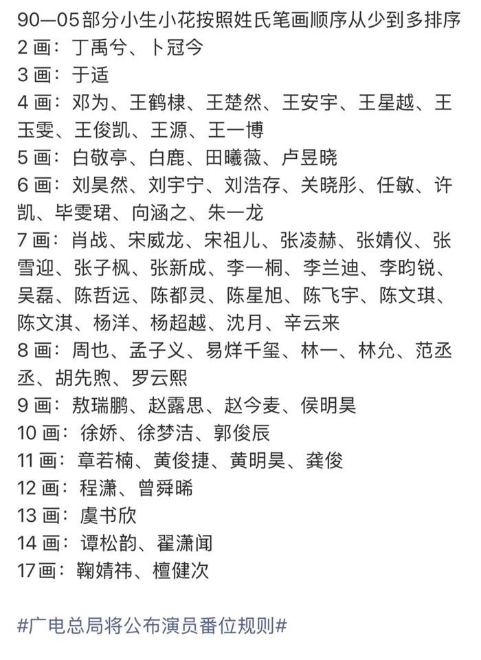 有网友迅速拉出一份“90-05部分小生小花姓氏笔画排序”——丁禹兮2画登顶,于适3画紧随其后,而17画的鞠婧祎、檀健次只能垫底。有人调侃:“以后选角先看姓,丁姓演员赢在起跑线。”