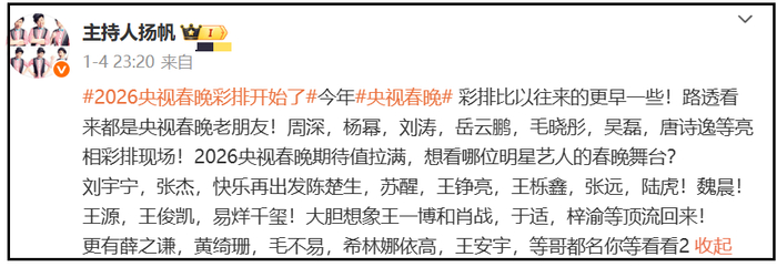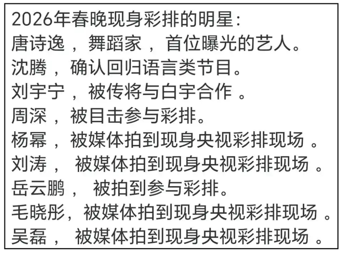 除了有路透照的明星,网上也曝光了一份关于春晚彩排的嘉宾名单,包括周深,杨幂,刘涛、岳云鹏、毛晓彤、吴磊等艺人同样出现在名单中。