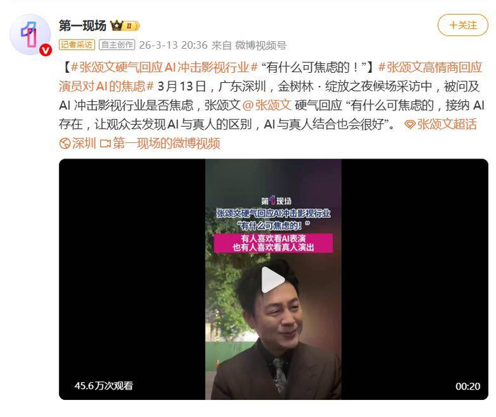 张颂文回应“AI冲击影视行业是否焦虑”:有什么可焦虑的,接纳AI存在,让观众去发现AI与真人的区别