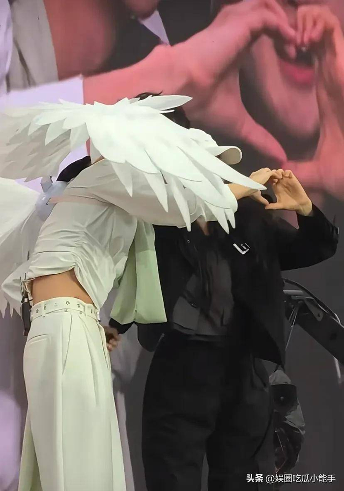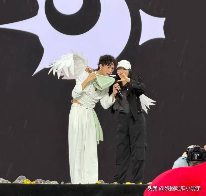 当天现场来了不少歌迷,恩利穿了一身白色西装,脖子上系了一条浅绿色丝巾,背上还装了一对白色翅膀,造型挺特别的。