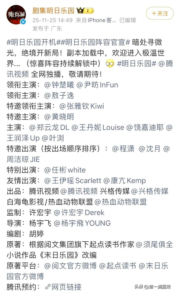 这次她加盟的《明日乐园》可不是小制作,妥妥的腾讯视频S级科幻剧。这部剧改编自阅文集团的热门小说《末日乐园》,由曾执导《异人之下》的许宏宇担任监制,剧情设定在“极温世界”,讲的是极端高温环境下人类的生存挑战,题材很有看点。