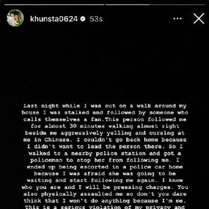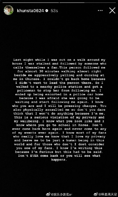 2026年3月13日晚,韩国艺人尼坤在Instagram发文披露,他在首尔住所附近散步时,被一名自称粉丝的女性尾随近30分钟。该女子不仅贴身跟踪、肢体碰撞,更全程使用中文高声辱骂并发出攻击性喊叫。为保护住址隐私,尼坤选择走向警局求助,最终由警车护送返家。他明确表示已掌握对方相貌、就读学校等信息,将提起诉讼并禁止其参与未来活动,同时强调此类行为不属于真正的粉丝。事件中中文成为施害者的显著标识,被尼坤在控诉中多次提及,也成为后续舆论发酵的关键导火索。
