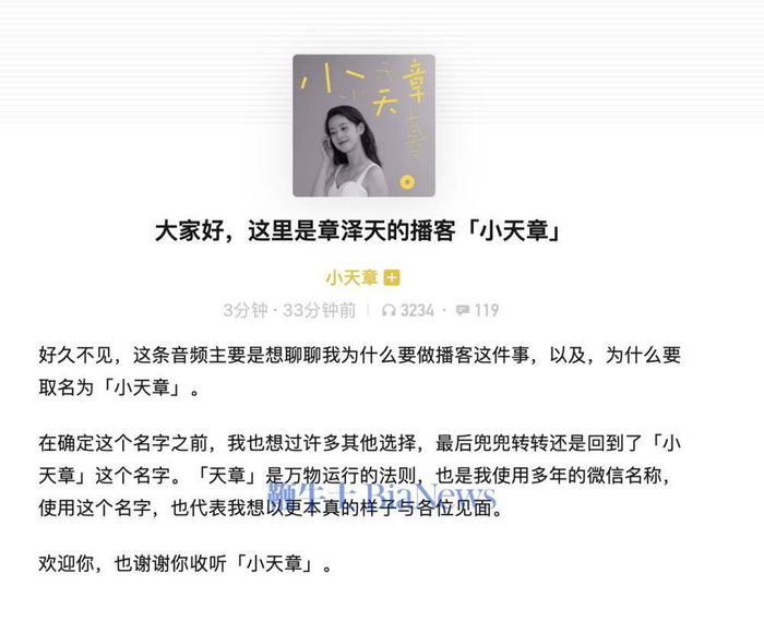 停更45天!章泽天播客「小天章」第二期今日上线
