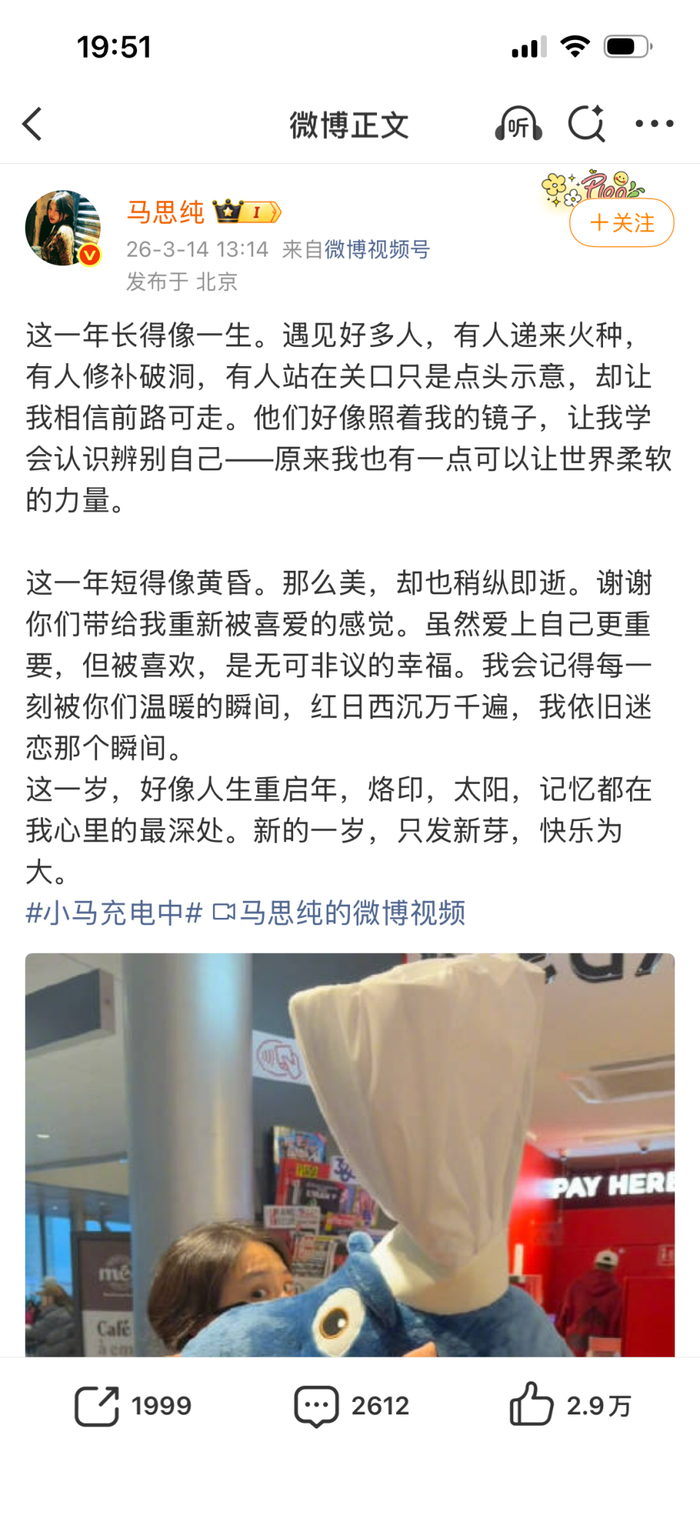 3月14日马思纯迎来38岁生日,这位1988年出生的女演员当日发文回顾过往,以“这一年长得像一生,也短得像黄昏”感慨成长,直言新岁“只发新芽,快乐为大”,宣告人生重启。