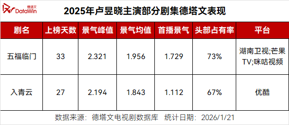 而比短期爆发力更受资方青睐的,是其主演作品的高稳定性与低风险性。徳塔文监测显示,卢昱晓近一年主演的四部剧集从杀青到播出的平均周期均在8个月左右,横跨不同题材且项目周转率高,对于出品方和平台而言,意味着高效的资金周转与可预期的内容供给。