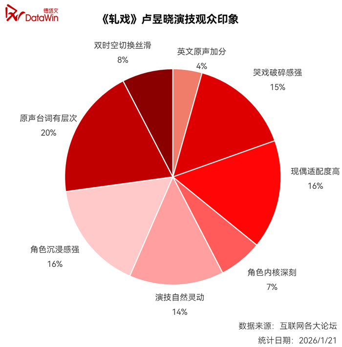 以上,结合卢昱晓的演技观众印象——原声台词有层次占比20%,角色沉浸感强和现偶适配度高占比16%,哭戏破碎感强占比15%,双时空切换丝滑占比8%,英文原声加分占比4%可知,在吃透人物的基础上,其不断进步的演技,让越来越多观众对“胡羞”投来了关注目光。