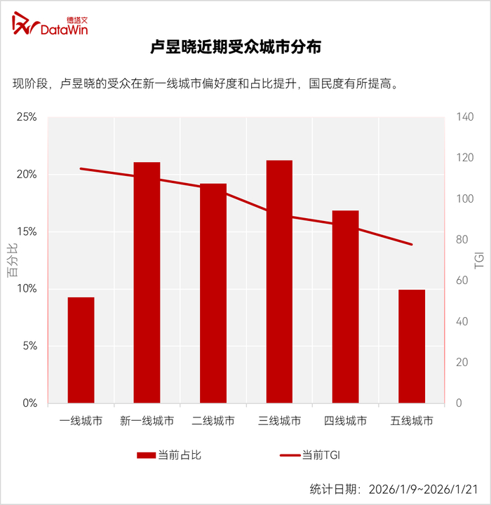 据观察,《轧戏》更新期间,卢昱晓受到18-23岁年轻女性观众的热烈关注,其粉丝在高线城市的占比和偏好度(TGI)有所提升,本人在下沉市场的国民度也有显著提高,便是强有力证明。