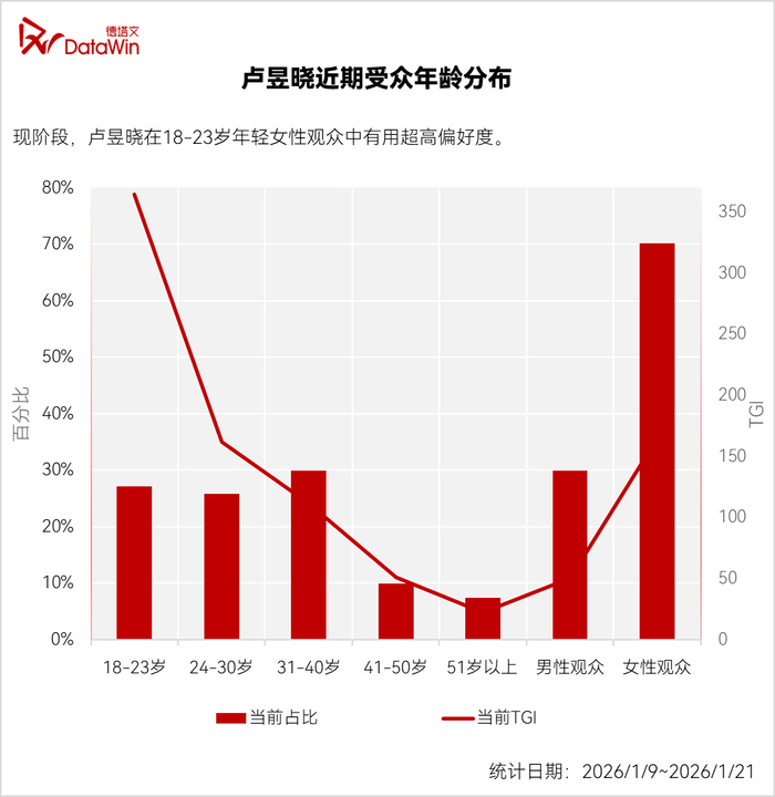 首先,其高回报潜力源于强大的跨平台的破圈传播力。从抖音、B站的二创热潮,到《轧戏》片段在外网斩获百万点赞,卢昱晓的作品总能激发观众成为“自来水”。这种现象的根基在于,她对18-23岁年龄段的核心受众(互联网声量主要贡献者)拥有极高的偏好度与吸引力。这批观众自愿为角色和故事进行二次创作与传播,形成了任何营销都无法替代的推广力量。