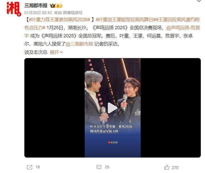 不久前,《声鸣远扬2025》迎来了总决赛,叶童和王濛等嘉宾也参与了其中。在节目中,叶童曾点名推荐王濛参与《乘风2026》的录制,并直言:2026就看你的了!对此,王濛也作出了回应,表示跨界挑战唱跳的确存在压力,但人生就是要不断突破舒适区。随即,王濛官宣参加乘风2026的话题火速登上热搜。大家都知道,王濛是短道速滑的冠军,她在综艺方面也有着不小的天赋。与黎明一起录制的综艺片段时常被网友翻出,大家都被她的搞笑表现逗乐。