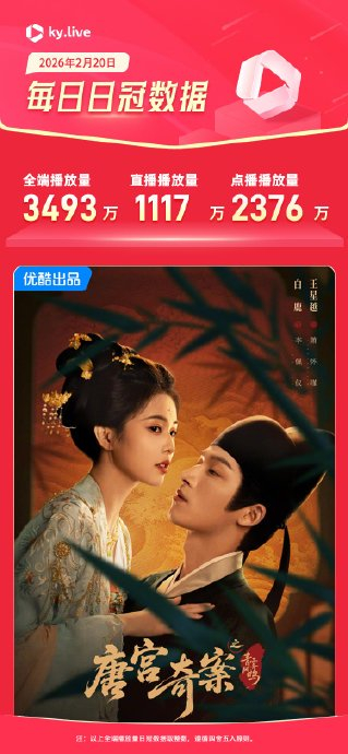 2026年2月初,《唐宫奇案》主演白鹿、王星越、赵晴在优酷扫楼活动中的趣味互动引爆全网,带动该剧播放量单日飙升至3578.5万,创下灯塔数据单日榜首纪录,并推动剧集热度突破平台峰值。
