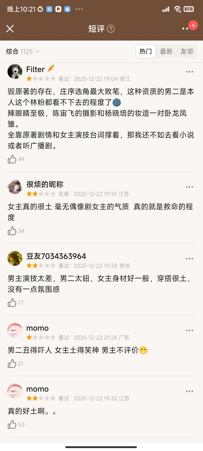 还有男二的颜值也遭到了观众无情审判,认为庄序不好看,"脖子长像羊驼"等外形调侃也成热议梗,宋威龙饰演的林屿森以"西装冷都苏感""医生造型"形成碾压式对比。赖伟明也没有整容式演技,扮演的庄序表情僵硬,演技生涩。