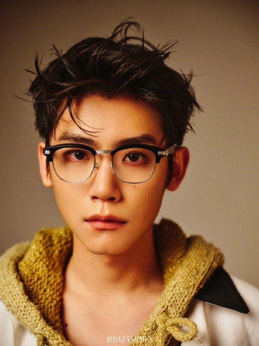李卿的面部特征构成"好男大"标签的核心要素:猫咪唇形与下垂型小狗眼赋予其无辜懵懂的神态,而白皙干净的皮肤状态和未经雕琢的素颜感进一步强化邻家学长形象(如《芭莎男士》大片中米白针织衫造型)。金丝眼镜等学院风配饰的运用,更将这种气质转化为可被时尚定义的视觉符号。