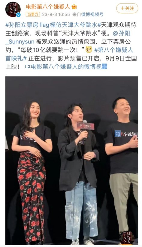 在《第八个嫌疑人》的济南路演活动上,该片的主演孙阳现场被科普“天津大爷”跳水梗,也现场放话“每破十亿,就跳水一次”,引得全场笑声不断,话题性十足。