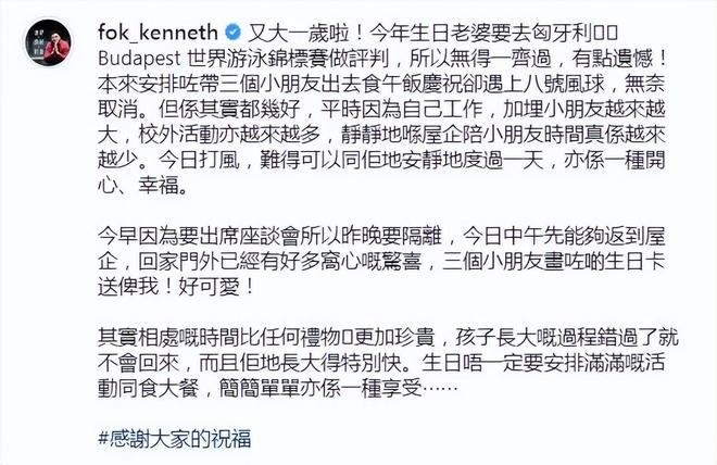 7月2日霍启刚发文称又大了一岁,生日当天老婆郭晶晶要去匈牙利参加世界游泳锦标赛的评判,所以不能一家人集齐,有一点遗憾。