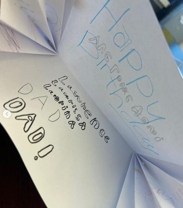 大儿子霍中曦给父亲晒出了卡片,送给父亲庆祝他的43岁生日。卡片上写着生日快乐老爸,然后有蛋糕有植物大战僵尸的一些小细节,哈哈,小朋友好有爱的感觉。