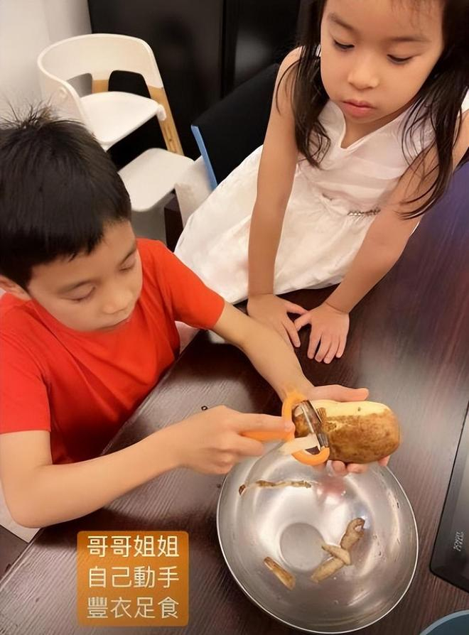 哥哥姐姐们自己动手,丰衣足食。霍中曦拿着一个土豆在盘子里削皮,妹妹则站在哥哥的身边认真的看着,这样子的场景真的太有爱了。