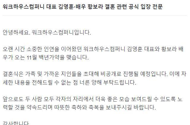 你好。 这里是管理公司。 长期保持珍贵缘分的金英勋和黄宝拉演员将于11月签订百年佳约。 婚礼将公开举行家人和熟人。 关于这一点,我不能告诉你详细情况,请谅解。 我保证,今后两个人都会努力在各自的位置展现出更好的样子。 请给我温暖的祝贺和祝福。 谢谢你。