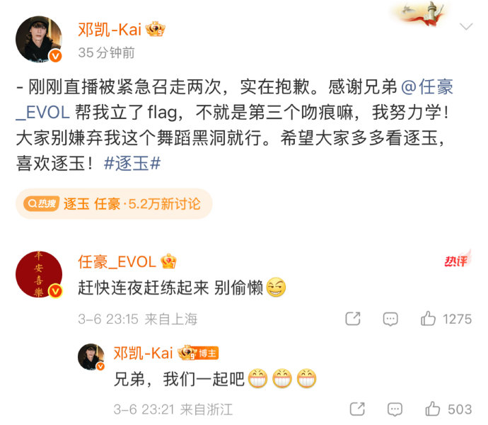 2026年3月6日,《逐玉》开播宣传期间,邓凯在个人直播中因工作安排两度被中途打断。正当他匆忙返回镜头向观众致歉时,搭档任豪突然在互动区以“立flag”形式发起挑战:“不就是跳《第三个吻痕》嘛,我帮你应了!” 这一即兴调侃瞬间点燃弹幕——任豪巧妙借用了当时网络热门舞蹈《第三个吻痕》的传播热度,同时精准戳中邓凯自嘲“舞蹈黑洞”的软肋。