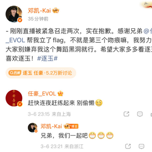当邓凯直播立flag挑战《第三个吻痕》时,任豪主动参与共舞策划并督促练习。这种跳出流程的即兴合作,被粉丝解读为"对集体心愿的隔空回应"。更典型的是他常在工作间隙空降超话分享排练日常,将幕后挥汗的片段转化为给粉丝的"专属彩蛋",使舞蹈不仅是表演,更成为连接情感的媒介。