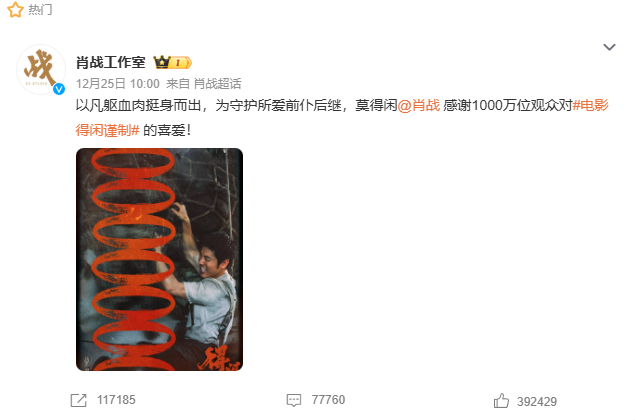 昨天上午9点,人民日报发布的年终暖心短片《为自己喝彩》突然刷屏网络。 短片开头,肖战以讲述人身份出现,画面中穿插着四部年度影视作品的片段——《哪吒之魔童闹海》《南京照相馆》《沉默的荣耀》以及他主演的电影《得闲谨制》。