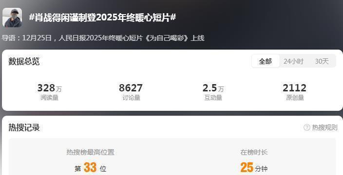 短片发布后仅3小时,“肖战得闲谨制登2025年终暖心短片”话题阅读量突破328万,互动量达2.5万。 肖战本人同步在社交平台发文:“每一个奋力向前的你,都是平凡生活里的英雄。 就在此刻,为自己喝彩、为我们的2025喝彩。 ”这条动态与短片结尾他出镜说的“敬此刻,敬未来”形成呼应,迅速获得超百万点赞。