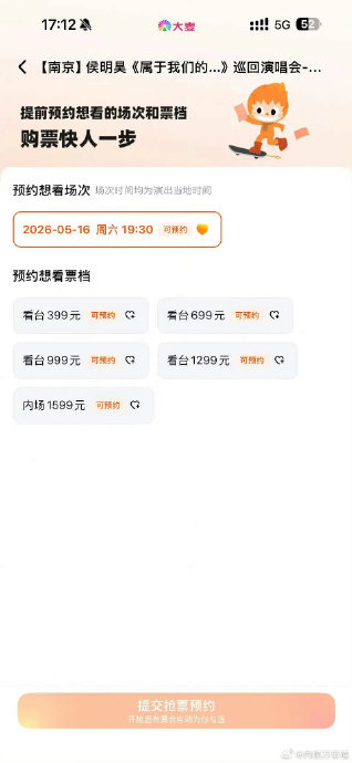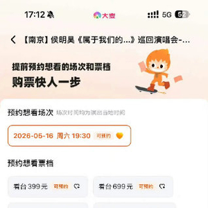 侯明昊《属于我们的…》巡回演唱会南京站将于2026年5月16日在南京梦之蓝青奥体育公园体育馆燃情开唱,票价分为四档(399元/699元/999元/1599元),座席布局以内场+看台分区设计,其中内场前排与看台114/113/124/125区为黄金视角,而205-209区因独特视野被粉丝戏称为“性价比坐牢位”。