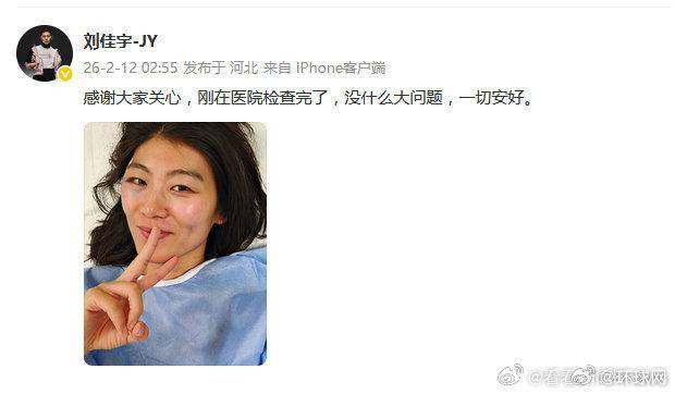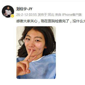 2月12日凌晨,刘佳宇发文报平安:感谢大家关心,刚在医院检查完了,没什么大问题,一切安好。