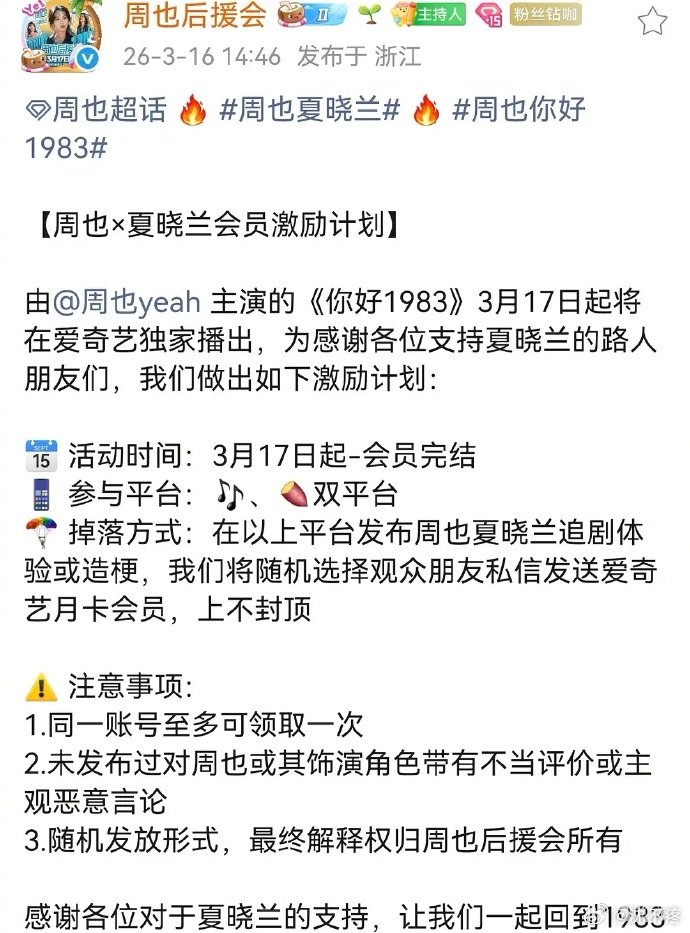 周也后援会改随机送会员,替代云包场回馈剧粉 沈不疼 优质娱乐领域创作者 03.1709:04 关注 周也后援会不搞云包场了,搞随机送会员,主要送的是在两个平台上分享过追剧内容的观众。这样跟云包场比,算不算更“有效花钱”一点?