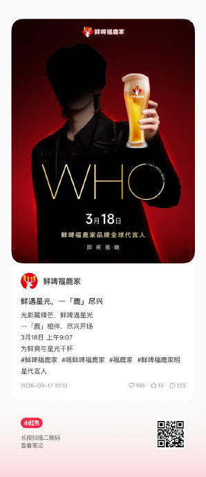 官宣节点:品牌于3月17日开启多平台预热,宣布将在3月18日9:07揭晓首位全球代言人身份。鹿晗工作室及粉丝账号同步号召“官宣后再关注品牌”,配合话题#鲜啤福鹿家#提前造势。