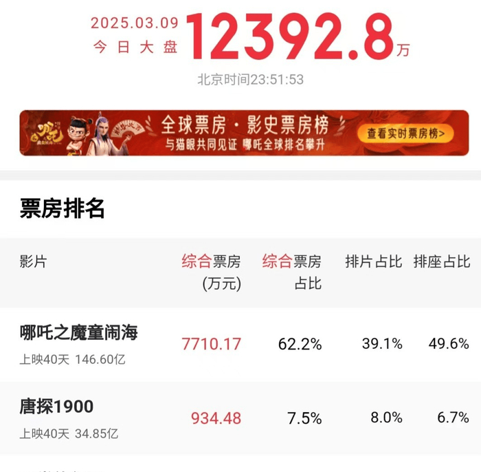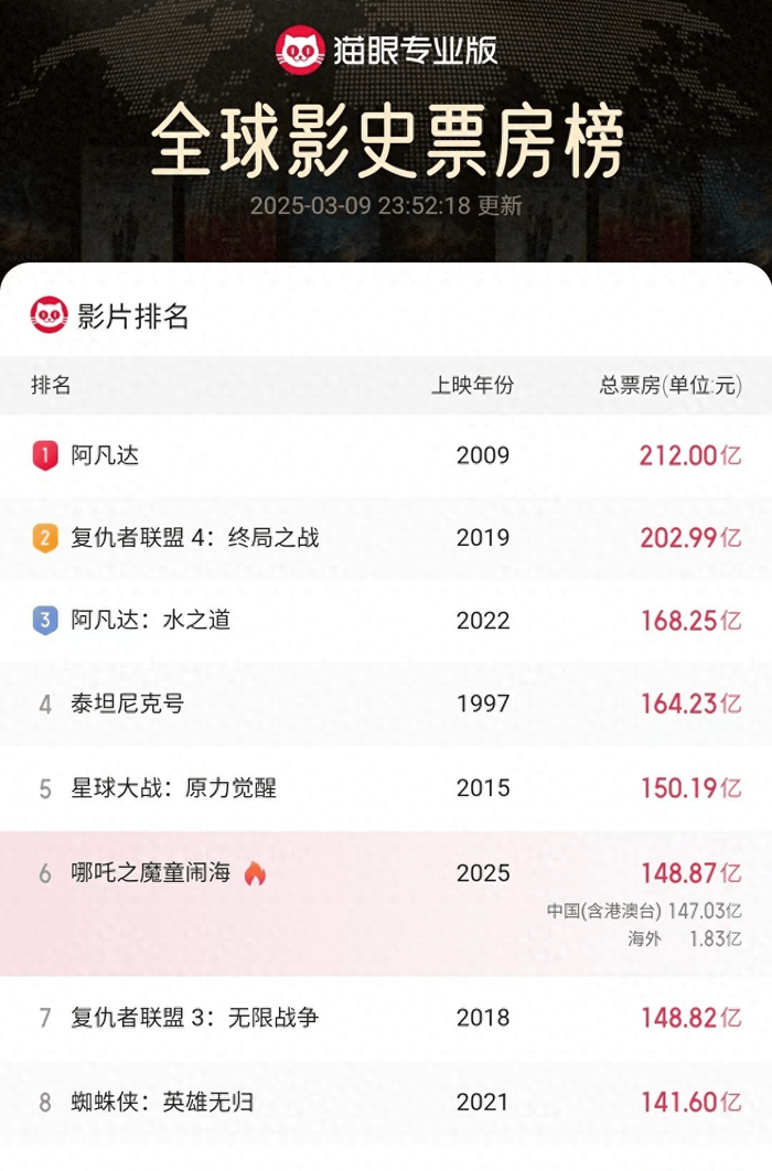 3月9日《哪吒2》票房完美收官,登顶全球影史第六