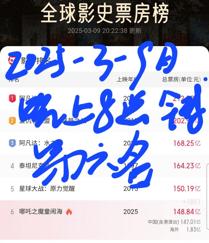 仅仅过了8天,也就是3月9日晚上6点47分,《哪吒2》再次上升一个名次,晋升至第六名。