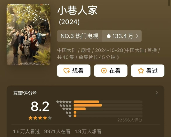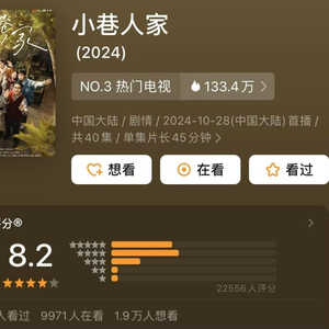 《小巷人家》是正午阳光的又一力作,该剧播出后,收获了很好的口碑,豆瓣开分8.2分,从剧情到演员的演技,观众的认可度都非常高。