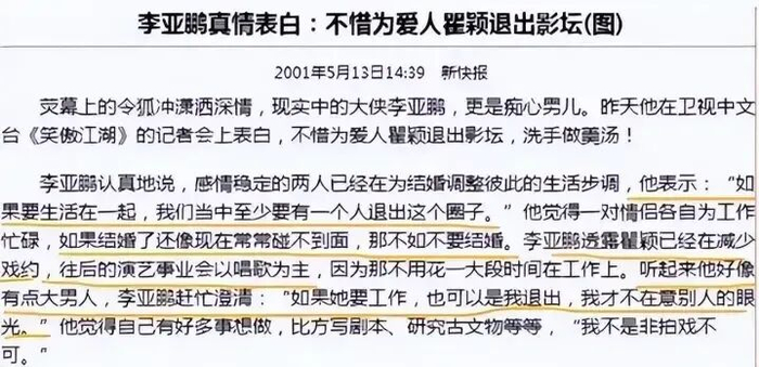 2001年5月,李亚鹏在《笑傲江湖》记者会上,隔空向瞿颖示爱,甚至表示愿意为了瞿颖退出影坛,洗手作羹。