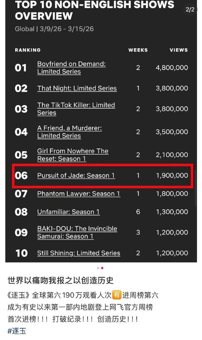 从开播到现在已经上了3000多个热搜了,而且成为有史以来第一部登上网飞官方周榜的内地剧,以 190万观看人次位列第6名,创造了国产剧出海的新纪录。