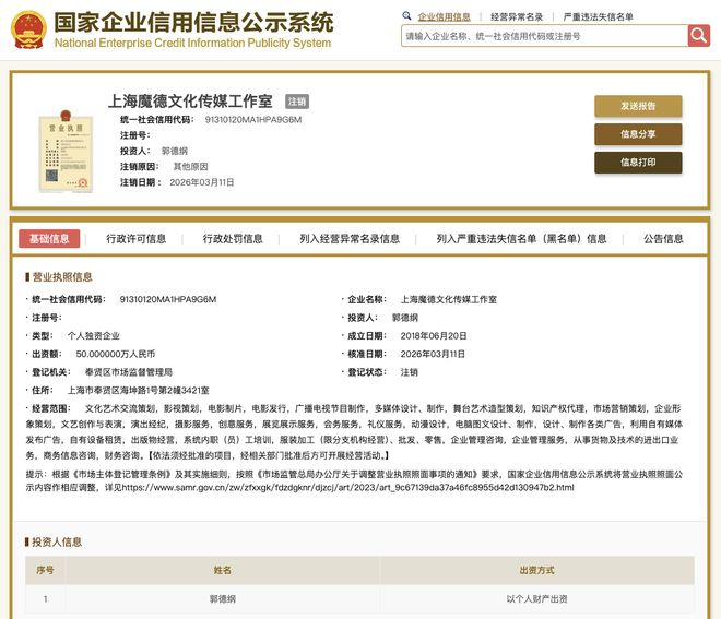 国家企业信用信息公示系统网站显示,2026年3月11日,上海魔德文化传媒工作室登记状态由存续变更为注销,注销原因为其他原因。
