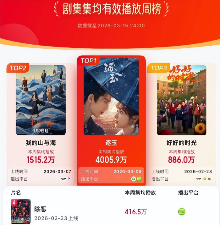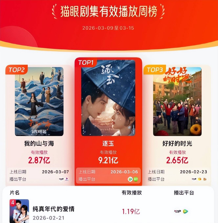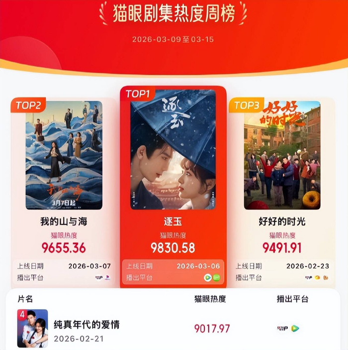 张凌赫、田曦薇《逐玉》分别登顶剧集热度、有效播放等三榜霸榜!