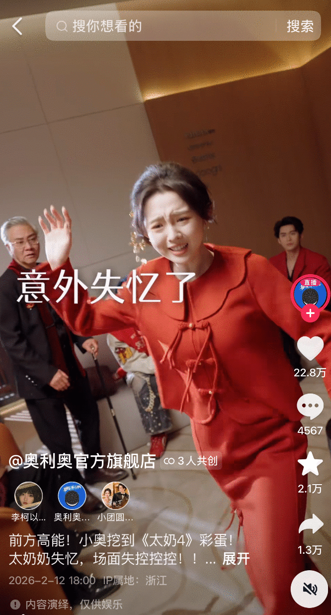 《十八岁太奶奶》系列是近年来的短剧爆款IP,主要讲述少女长辈和子子孙孙的故事。《太奶4》延续前三季,通过“甜酷太奶奶”与“七位男妲己”等群像戏设定,获得超高人气。截止2月底,《太奶4》播放量超过25.48亿次。第四季合作食品与美妆品类品牌奥利奥、自然堂、袋鼠妈妈、娇兰等,契合情人节和春节两个节日场景。制作方为品牌定制了多种玩法。其中“剧集彩蛋”作为独立的剧集,延续原有人物关系,围绕品牌展开故事,虽是广告却更像番外内容。