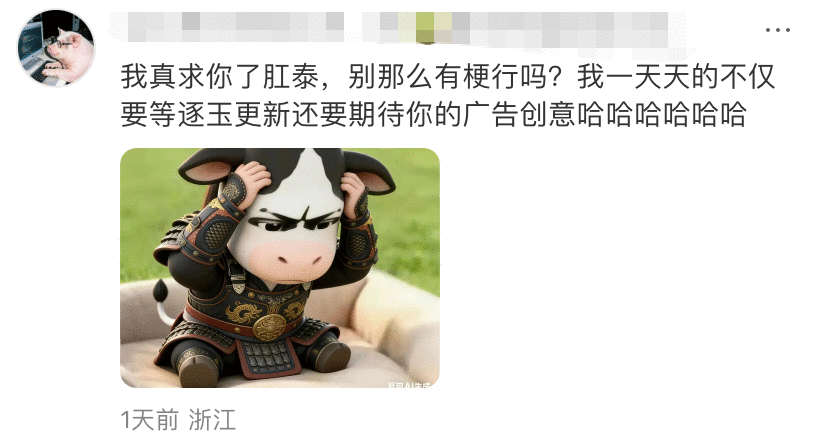 擅长将剧情、人物角色与“贴”“菊花”组合在一起的肛泰,简直太有梗了。网友表示:广告词给到夯;我一天天的不仅要等逐玉更新,还要期待你的广告创意