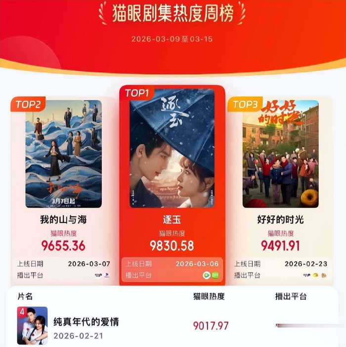 这部剧的成绩也非凡,几乎是三榜霸榜。据猫眼专业版数据显示,《逐玉》在2026年第10周剧集热度、有效播放和集均有效播放三项数据上,均荣登榜首。这样的成绩,简直是太强大了!说实话,看到这些数据,小编只能说这部剧的表现实在太令人惊艳,你们看了吗?相信不少人已经被这部剧的剧情和演员的精彩表现深深吸引了吧。