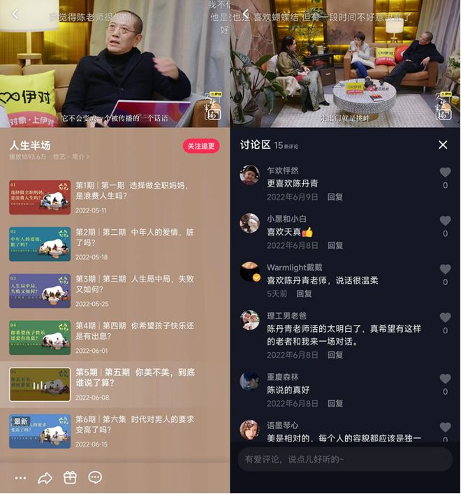《人生半场》第2季是西瓜视频自制的深度谈话节目,聚焦职场瓶颈、家庭事业平衡等中青年群体的现实困惑,一共10期,现已更新6期,每周三晚18:30在抖音、西瓜视频、鲜时光tv同步更新。