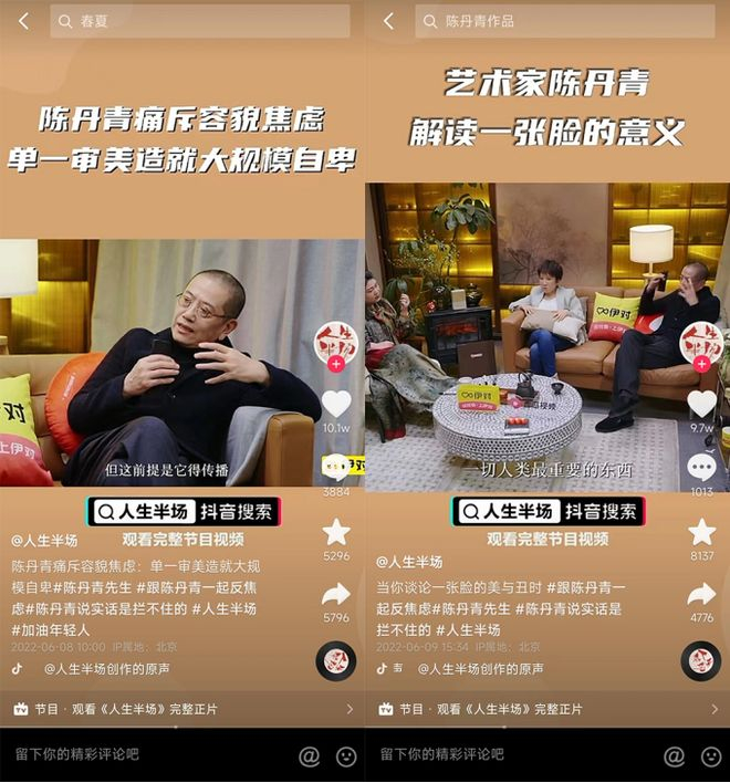 近日,著名画家陈丹青、抖音创作者张踩铃做客《人生半场》节目,与主持人杨天真交流“容貌焦虑”话题。节目中,陈丹青从自身经历与绘画专业角度,分享了对容貌美的看法,他认为每个人都会有美的瞬间,呼吁人们不要被容貌焦虑所困扰。截至6月16日,相关节目切片在抖音获赞数超10万。