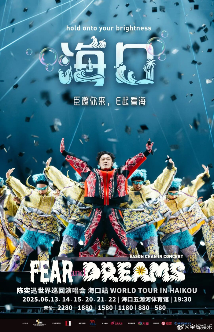 据悉,2025年6月14、15、20、21、22日,陈奕迅FEAR and DREAMS 世界巡回演唱会海口站举行,原定于6月13日的首场因台风取消,其后5场正常进行。